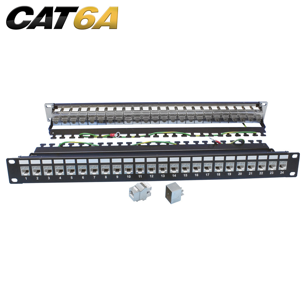 Quest offers a Modular Cat6A shielded patch panel solution for high-speed 10Gb data transfers. These patch panels include 180o keystone jacks and has a built-in cable manager.